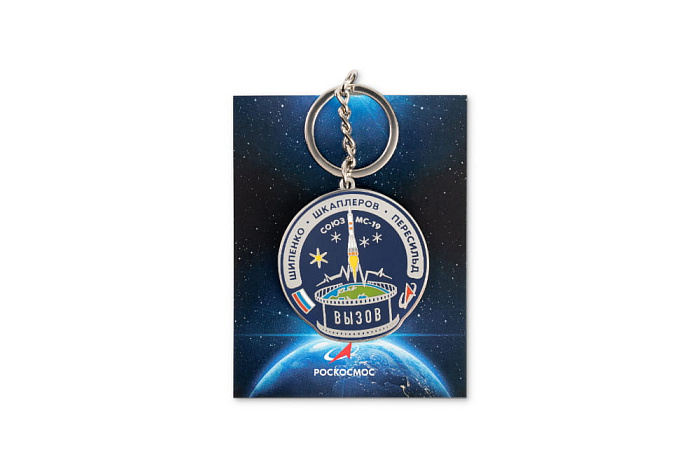 Брелок Союз МС-19 двухсторонний с логотипом Госкорпорации "Роскосмос" и надписью "Вызов", КТ/ГЛ