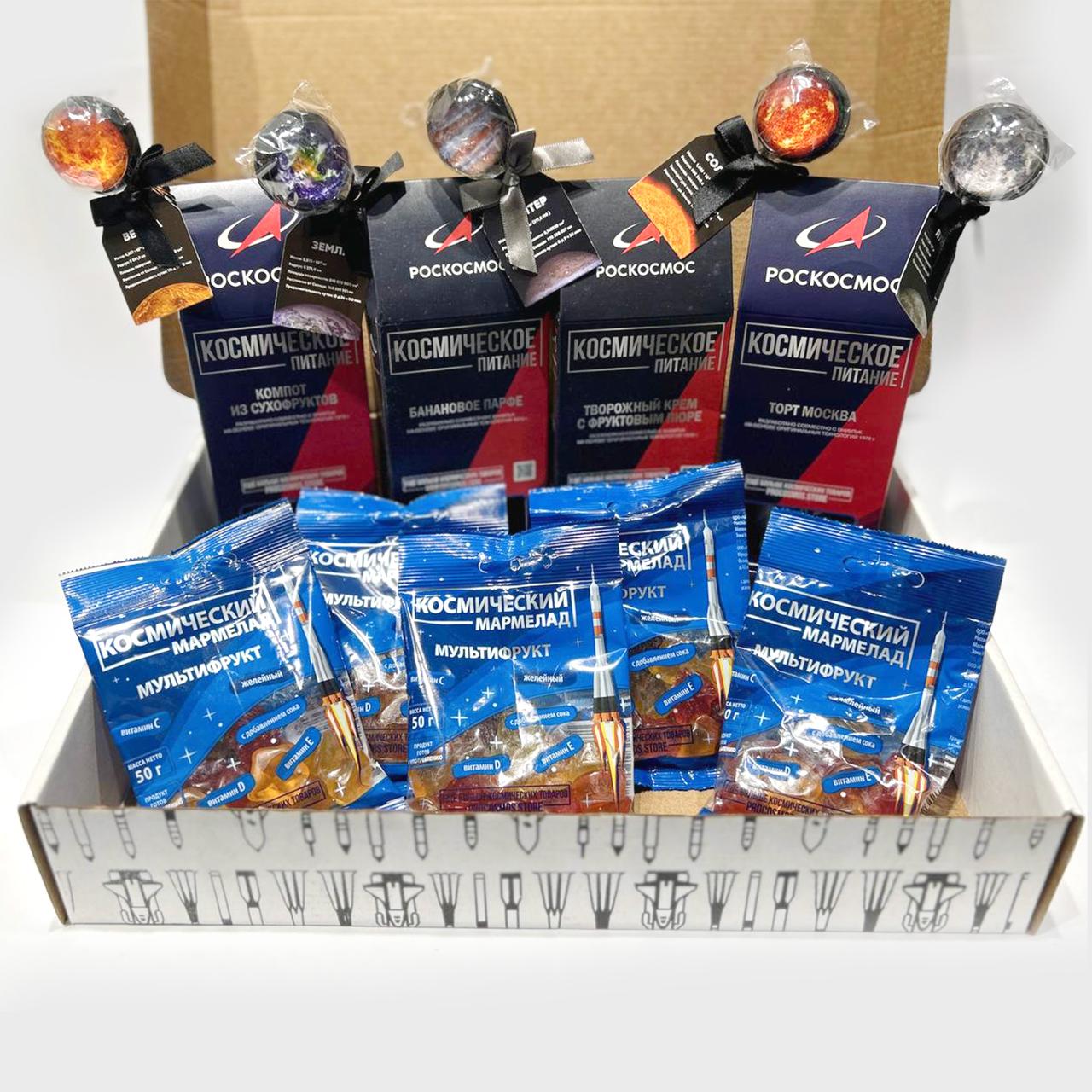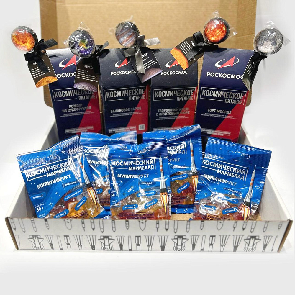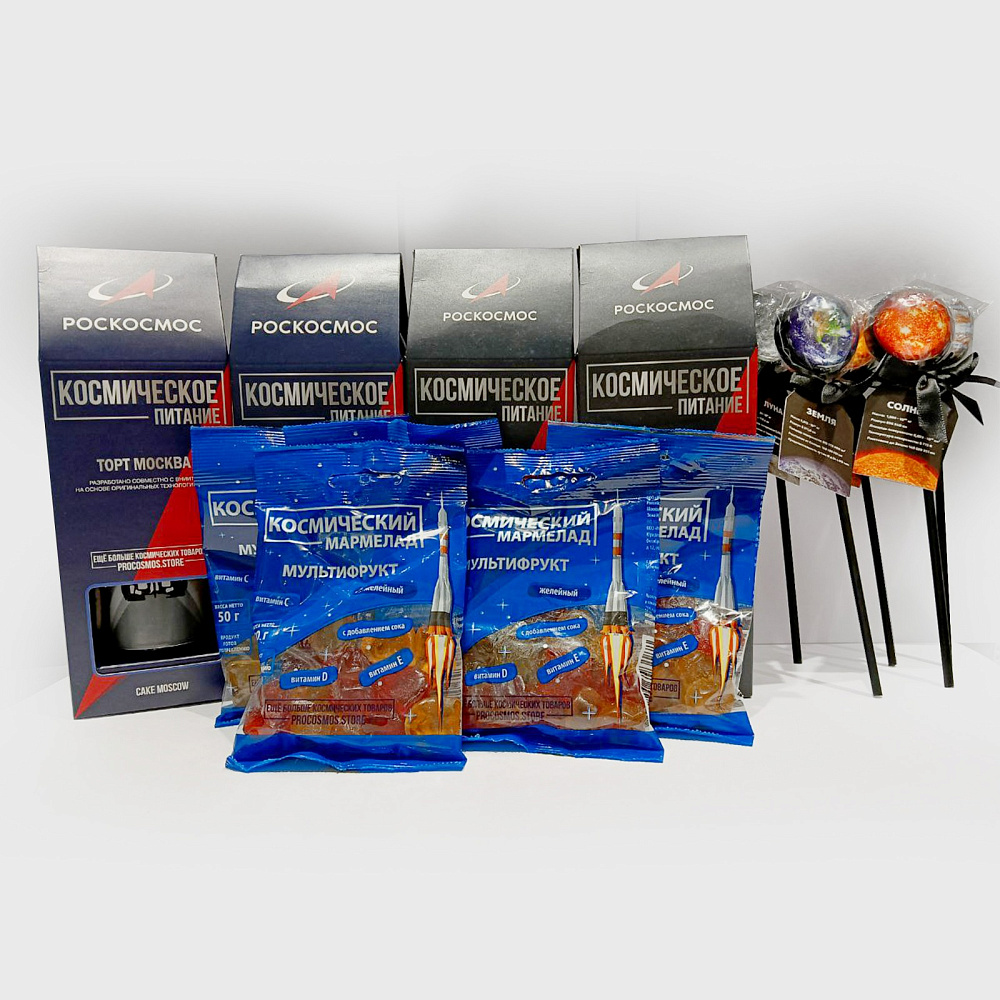 Космическое питание Торт Москва РК, тюбик; Космическое питание Творожный крем с фруктовым пюре РК, тюбик; Космическое питание Банановое парфе РК, тюбик; Космическое питание Компот из сухофруктов РК, тюбик; Леденец на палочке Земля вкус кола; Леденец на палочке Солнце вкус кола; Леденец на палочке Луна вкус кола; Леденец на палочке Юпитер вкус кола; Леденец на палочке Венера вкус кола