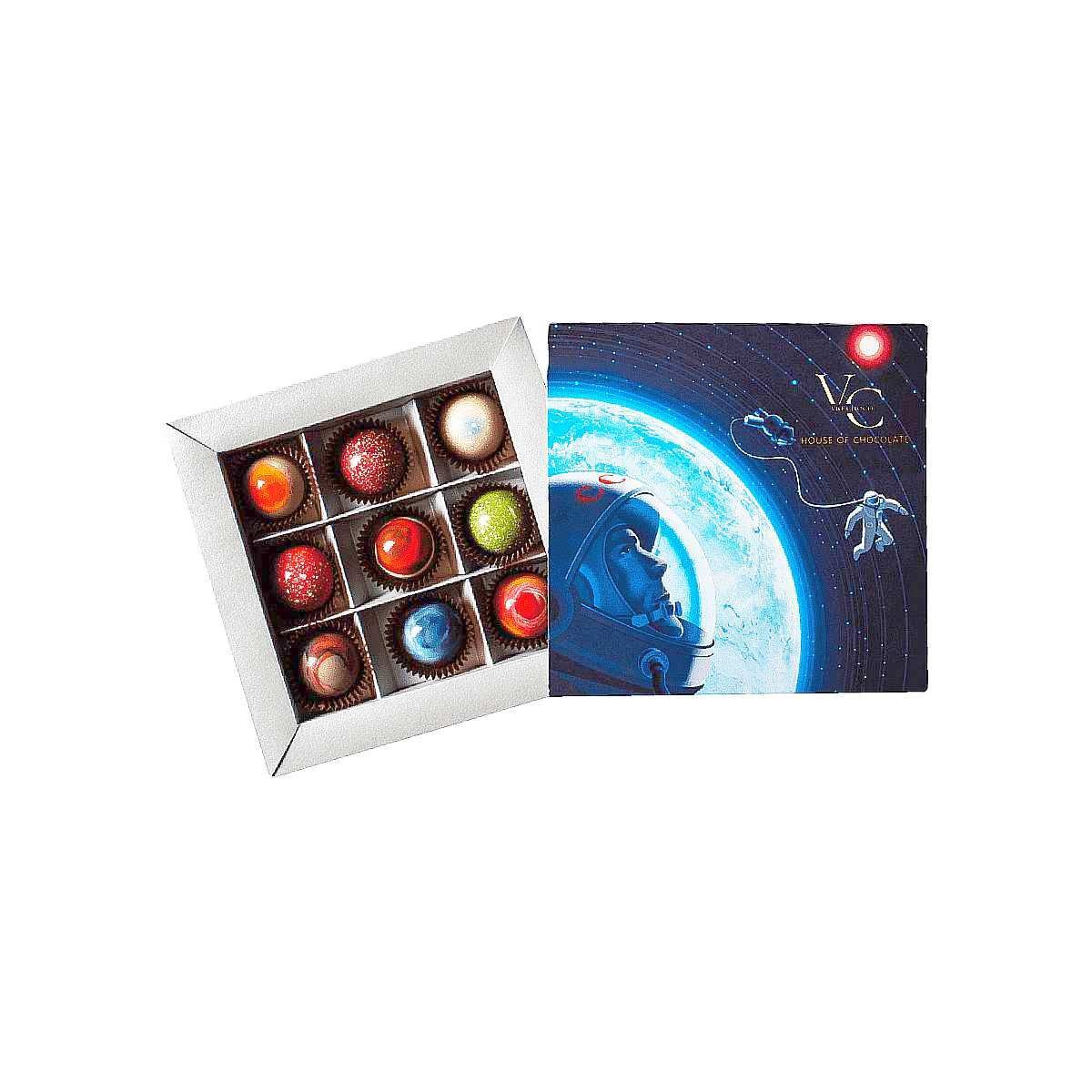 Венера: Корпус: молочный шоколад 33,5% (сахар, масло какао, сухое цельное молоко, какао тертое, эмульгатор: соевый лецитин, натуральный ароматизатор: ваниль). Начинка: сахар, глюкоза, пюре манго (манго, сахар), молочный шоколад 33,5%, сливочное масло 82,5%. Плутон: Корпус: молочный шоколад 33,5% (сахар, масло какао, сухое цельное молоко, какао тертое, эмульгатор: соевый лецитин, натуральный ароматизатор: ваниль). Начинка: какао-масло, пралине миндаль-фундук, молочный шоколад 33,5%, молотый кофе. Земля: Корпус: молочный шоколад 33,5% (сахар, масло какао, сухое цельное молоко, какао тертое, эмульгатор: соевый лецитин, натуральный ароматизатор: ваниль). Начинка: сливки 33-35%, чернослив, корица молотая, мед, молочный шоколад 33,5%, вино красное сухое, сливочное масло 82,5%. Марс: Корпус: молочный шоколад 33,5% (сахар, масло какао, сухое цельное молоко, какао тертое, эмульгатор: соевый лецитин, натуральный ароматизатор: ваниль). Начинка: какао-масло, пралине миндаль-фундук, молочный шоколад 33,5%, дробленый арахи